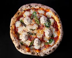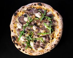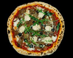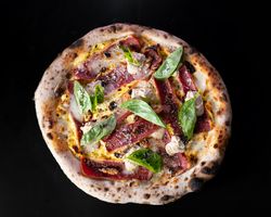 خمیر ناپولیتن و پولد بیف و سس کلاسیک برگر و سالسا گوجه و بیکن و پیاز قرمز و ریحان ایبتالیایی