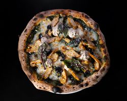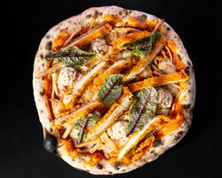 مرغ رست شده و سس پستو بالذیک و خمیر نالپل سبزینگ پیتزا و پنیر پیتزا و پنیرپارمسان