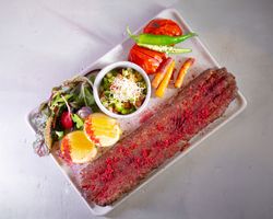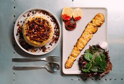 2 سیخ کوبیده گوسفندی 120 گرمی (به همراه سالاد شیرازی ، میکس سبزیجات مدرن ، فلفل کبابی ، گوجه ، هویج بنفش بلانچ شده ، لیمو و کته با ته دیگ سیب زمینی)
