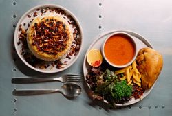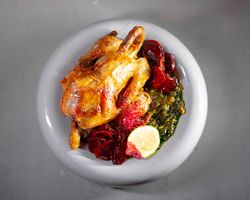 جوجه کامل 800 گرمی مزه دار شده با چاشنی تندوری (به همراه سالاد شیرازی ، میکس سبزیجات مدرن ، فلفل کبابی ، گوجه ، هویج بنفش بلانچ شده ، لیمو و کته با ته دیگ سیب زمینی)