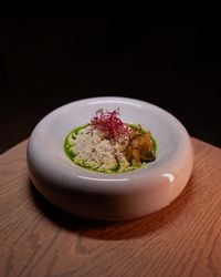 فرش پاستا با استایل فارفاله، اسلایس فیله گوساله مزه دار شده گریل و سس پستو و میکروگرین و پنیرپارمسان