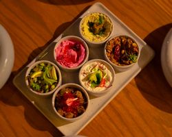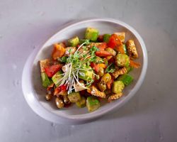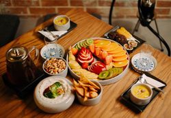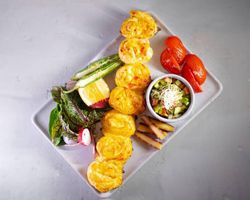 زیتون گریل ، نان کریسپی ، فلفل دلممه ای ، خیار ، گوجه ، پنیر لبنه ، سس مخصوص چوپان ، بیبی اسفناج