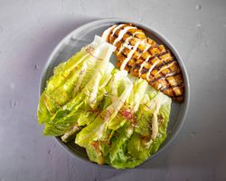 مغز کاهو رسمی و سینه مرغ گریل و نان کرو تن و سس سزار و روغن آروماتیک و سیزنینگ و پنیرپارمسان