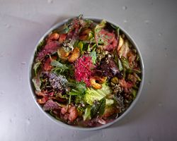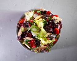فیله مرغ مزه دار شده گریل کاهوی روماین(فرانسوی ۲ رنگ) بیبی اسفناج روکولا گوجه خشک بادام هندی پنیر پارمزان میکروگرین آناناس همراه با سس مخصوص بولرو