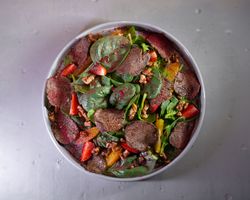 بی بی اسفناج و اسلایس فیله گوساله مزه دار شده گریل و پرتقال و توت فرنگی و گردو و درسینگ انار و بالزامیک و سیزنینگ سالاد و پنیر پارمسان