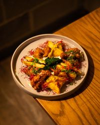 پاستا سرخ شده با خمیر سیب زمینی و سینه مرغ کریسپی و سس اگ پلنت تومیتو و قارچ و پنیرپارمسان