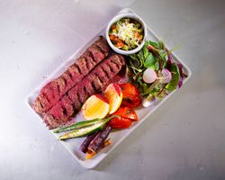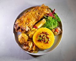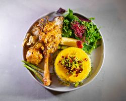راسته گوسفندی مزه دار شده (به همراه سالاد شیرازی ، میکس سبزیجات مدرن ، فلفل کبابی ، گوجه ، هویج بنفش بلانچ شده ، لیمو و کته با ته دیگ سیب زمینی)