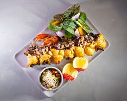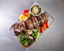 شیشلیک گوسفندی مزه دار شده با چاشنی های ترکیه ای (به همراه سالاد شیرازی ، میکس سبزیجات مدرن ، فلفل کبابی ، گوجه ، هویج بنفش بلانچ شده ، لیمو و کته با ته دیگ سیب زمینی )