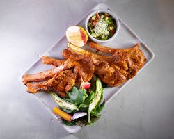 راسته گوسفندی مزه دار شده با چاشنی ترکیه ای (به همراه سالاد شیرازی ، میکس سبزیجات مدرن ، فلفل کبابی ، گوجه ، هویج بنفش بلانچ شده ، لیمو و کته با ته دیگ سیب زمینی)