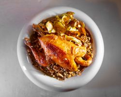 ران مرغ بدون استخوان مزه دار شده با چاشنی ترکیه ای (به همراه سالاد شیرازی ، میکس سبزیجات مدرن ، فلفل کبابی ، گوجه ، هویج بنفش بلانچ شده ، لیمو و کته با ته دیگ سیب زمینی)