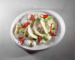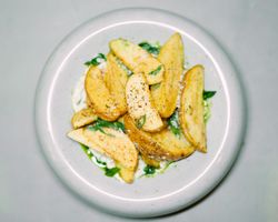 میکس گوشت چرخ شده مزه دار شده پیچیده در خمیر سیب زمینی همراه با دیپ ماست و پیازچه