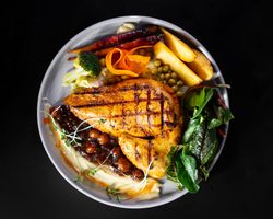 فیله مرغ مزه دار شده با چاشنی مخصوص و زعفرون (به همراه سالاد شیرازی ، میکس سبزیجات مدرن ، فلفل کبابی ، گوجه ، هویج بنفش بلانچ شده ، لیمو و کته با ته دیگ سیب زمینی)