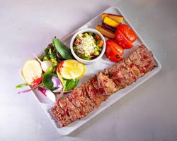 دنده گوسفندی و راسته گوسفندی مزه دار شده با چاشنی ترکیه ای (به همراه سالاد شیرازی ، میکس سبزیجات مدرن ، فلفل کبابی ، گوجه ، هویج بنفش بلانچ شده ، لیمو و کته با ته دیگ سیب زمینی)